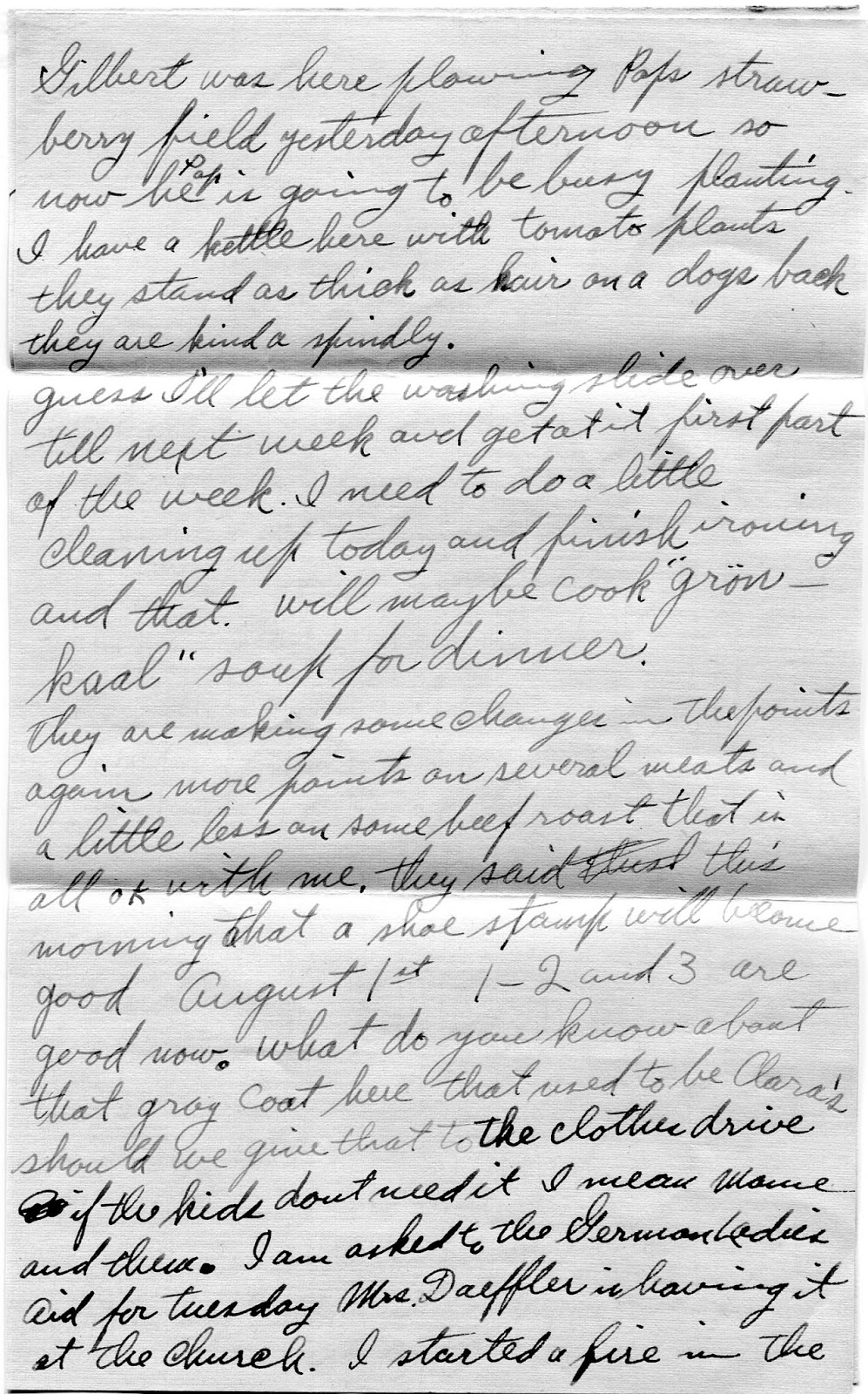 April 27, 1945: Grandma enjoyed Ladies Aid at Pilgrim and likes the pastor there better than Rev. Anderson at St. Peter's. She's been invited to Ladies Aid the following Tuesday at the German Lutheran church in Frederic (Immanuel), where Mrs. Daeffler (mother or Edna's best friend, Doris) will entertain. The Pilgrim ladies get reimbursed in sugar and ration-book points when they entertain (provide the lunch). Speaking of which, she enumerates changes that have been announced in the rationing program. (Rationing began in the United States in May 1942 and continued into 1946.)